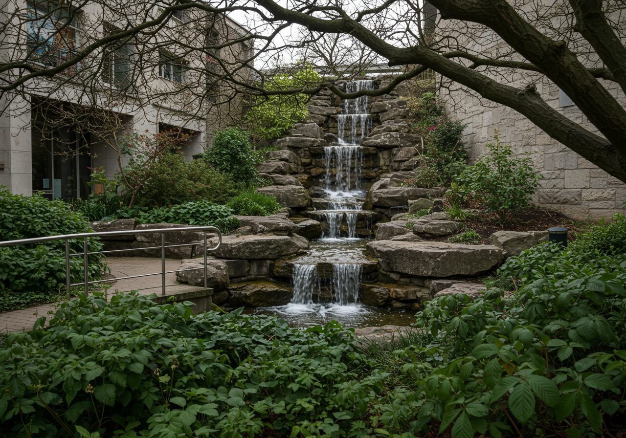 the 7th Floor Patio. A peaceful garden retreat from the boisterous city streets below, the park space is open to the public and includes tables and chairs and lush, well-maintained landscaping, including a lawn and mature shade trees.